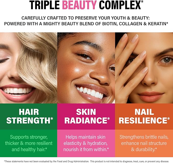 - Beauty Complex — reveal your natural beauty with our potent blend of Biotin, Collagen & Keratin in women’s multivitamin! This beauty complex supports stronger, thicker hair, enhances skin elasticity and hydration, and maintains nail strength & resilience. It nourishes your beauty from the inside out for a radiant, healthy glow every day!