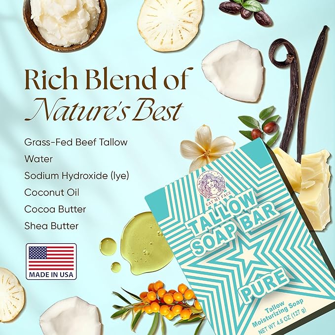 - BEEF TALLOW BAR SOAP FOR DEEP HYDRATION: Our beef tallow soap bar grass fed is crafted with organic grass fed beef organic tallow, providing a deeply moisturizing experience that leaves your skin soft and nourished. Perfect for use as a beef tallow face wash, tallow face moisturizer, or beef tallow for face care, this natural soap hydrates without greasy residue. Whether you use it as body soap sensitive skin or body soap bars, your skin feels refreshed with this Unscented soap.