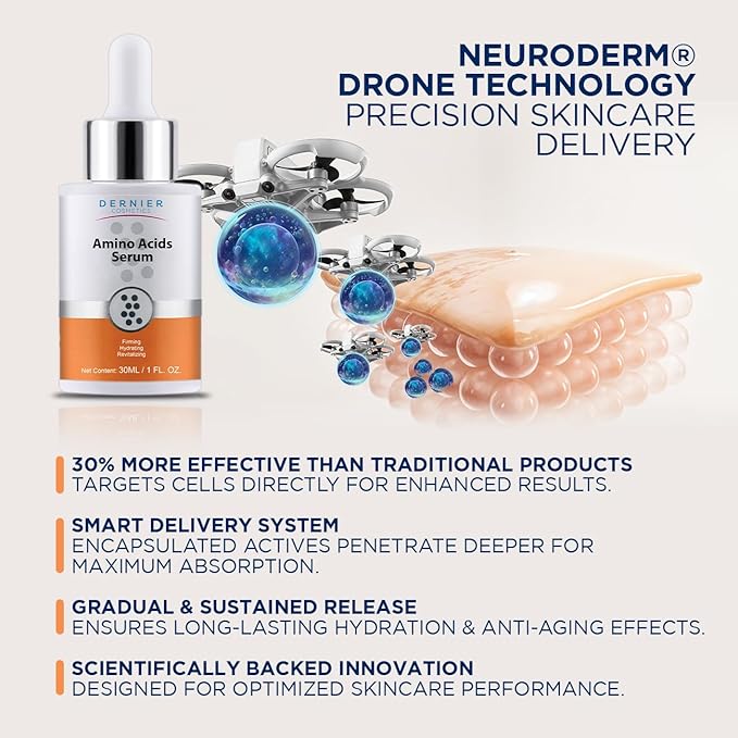 - AMINO ACID SERUM – Our Facial Revitalizing Serum uses cutting-edge Drone Technology to deliver amino acids directly to the cells, improving collagen and elastin synthesis for firmer, more elastic skin.