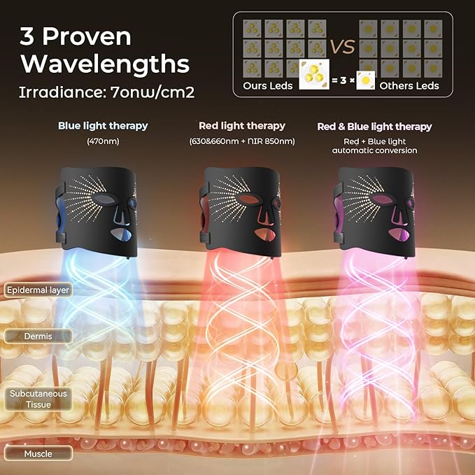 - 【3 Gears Red Light Therapy for Face】Red light (630nm) + Near-infrared light (830nm),3 gears.The combination of red light and near-infrared light which is the best combination to increase skin elasticity and gloss.Red light can help balance oil secretion.Red light helps improve skin redness.The irradiance of the product is 70nw/cm2.Experience the transformative effects of our red light therapy mask, designed to achieve rejuvenated, glowing skin.
