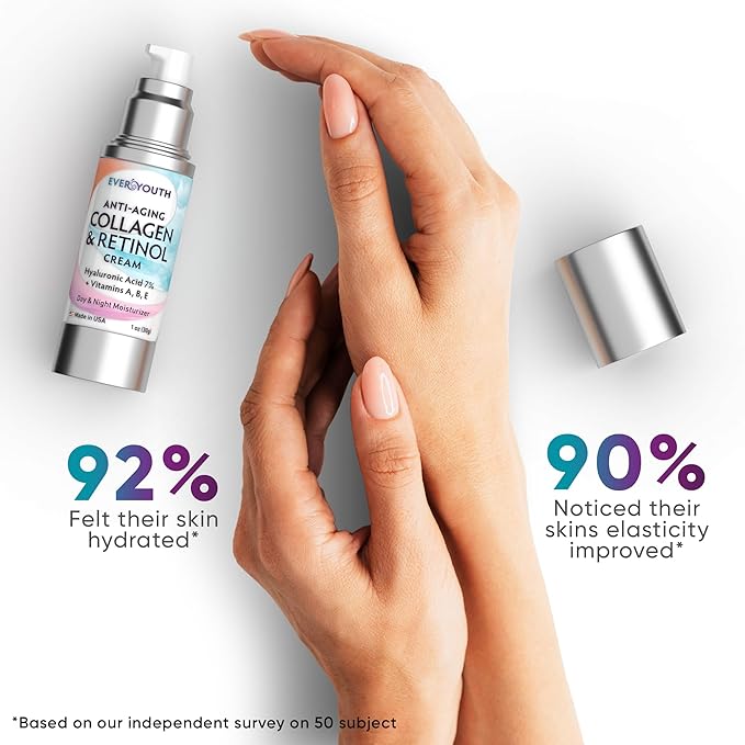 - Travel Size Face Moisturizer: Visibly reduce wrinkles in 1 week with Everyouth's retinol and collagen face cream moisturizer, packed with collagen for face women retinol cream, and 7% hyaluronic acid cream. This collagen skin moisturizer cream for face has shown to leave 100% of users with hydrated, soft and visibly refreshed skin. This isn’t just another anti wrinkle face cream for women or hydration face cream; it’s your travel size moisturizer collagen retinol hyaluronic acid cream, with 100% of women noticing a visible reduction in fine lines and wrinkles after just one week of use.