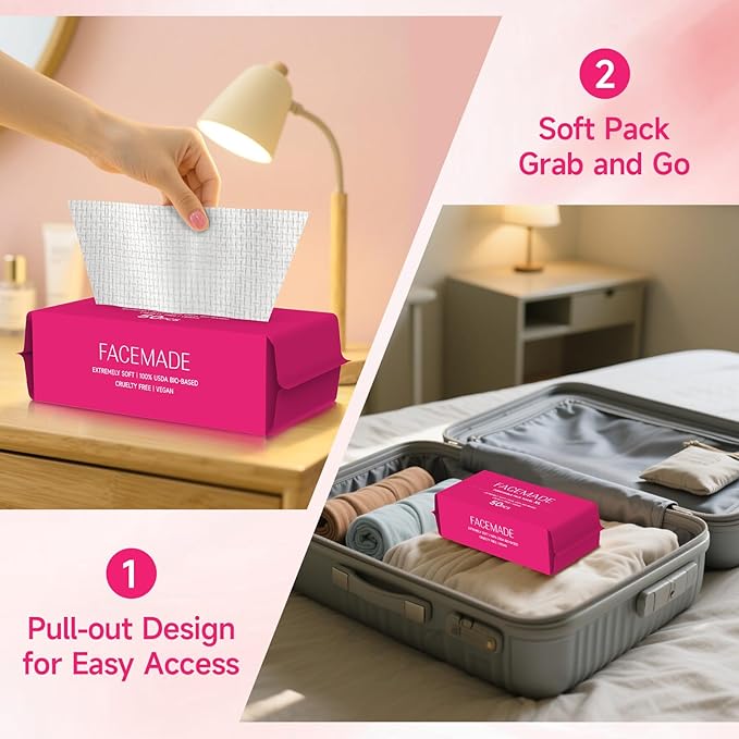- 100% Biobased & High Quality: FACEMADE face towels are crafted with the utmost care and precision. These clean face towels disposable are made of 100% viscose fiber. So these clean face towels are soft to the touch and gentle on your skin, ensuring a luxurious feel with every use. Certified 100% Biobased, you can trust in their reliability and quality.