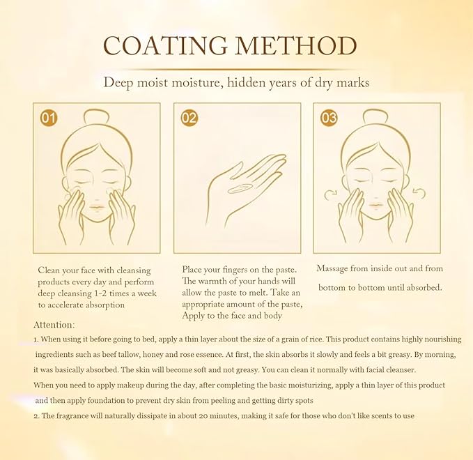 - Tallow and Honey Cream,This balm activates with the warmth of your fingertips—simply take a rice-grain-sized amount Daytime (Makeup Prep): After the basic skin care in the morning, apply a thin layer of butter cream,Apply foundation again. lock in all-day wear, and Prevent flaky peeling. Nighttime (Skin Nourishment): Slather on a slightly thicker layer before bed. It deeply nourishes skin, leaving it soft and supple while locking in moisture to fend off dryness. Over time, it helps reduce the look of fine lines, too.