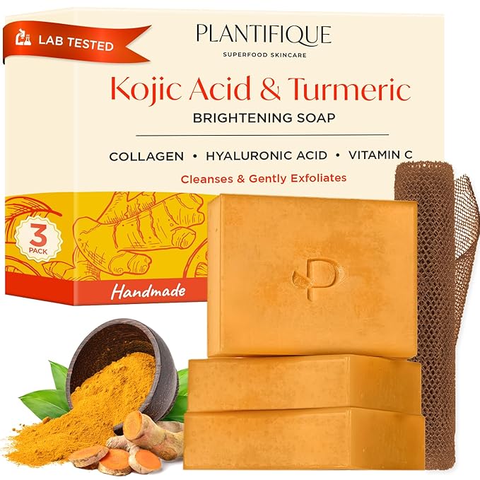 PLANTIFIQUE Kojic Acid Soap for Hyperpigmentation 3 Bars with African Net - Turmenic Soap with Hyaluronic Acid, Collagen, Vitamin C for Dark Spots - Vegan Skincare 240g / 8.47 oz