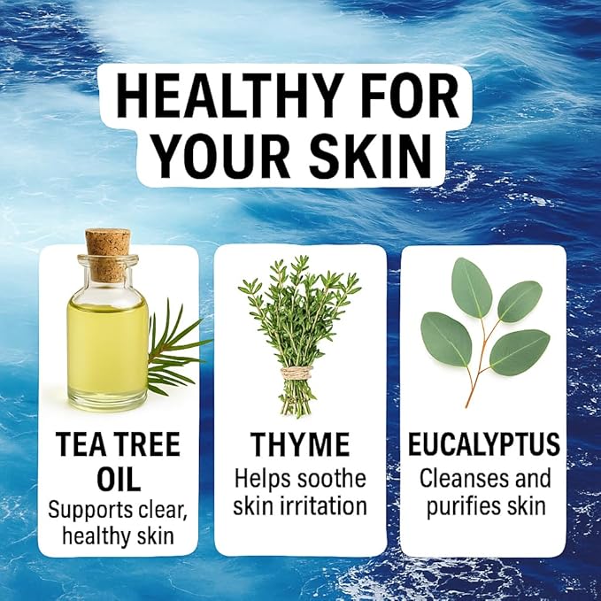 - HEALTHY FOR YOUR SKIN | Our super stack of Tea Tree Oil, Thyme, and Eucalyptus provides tremendous skin health benefits. Tea Tree Oil and Eucalyptus are great for it's skin health properties, but our favorite ingredient is the Thyme. Thyme is beneficial for wide range of skin issues.