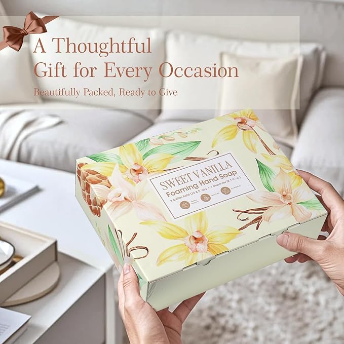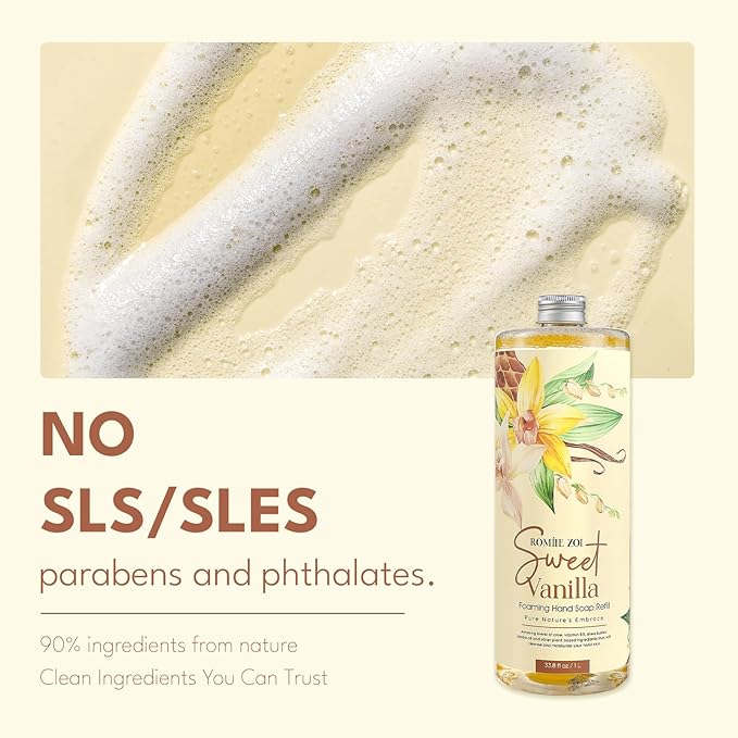 - 【Warm & Soothing】A rich and comforting vanilla fragrance that brings warmth to every wash. This foaming hand soap refill is plant-based, gentle, and perfect for daily use in the kitchen or bathroom.