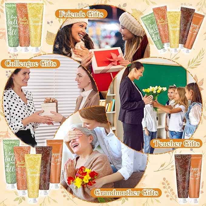 - Seasonal Fragrances in One Set: this fall hand cream set includes 20 tubes— 4 each of pumpkin, cinnamon, apple, orange, and vanilla; Enjoy a festive variety of scents with matching designs, perfect for fall gifts bulk and Thanksgiving favors for adults