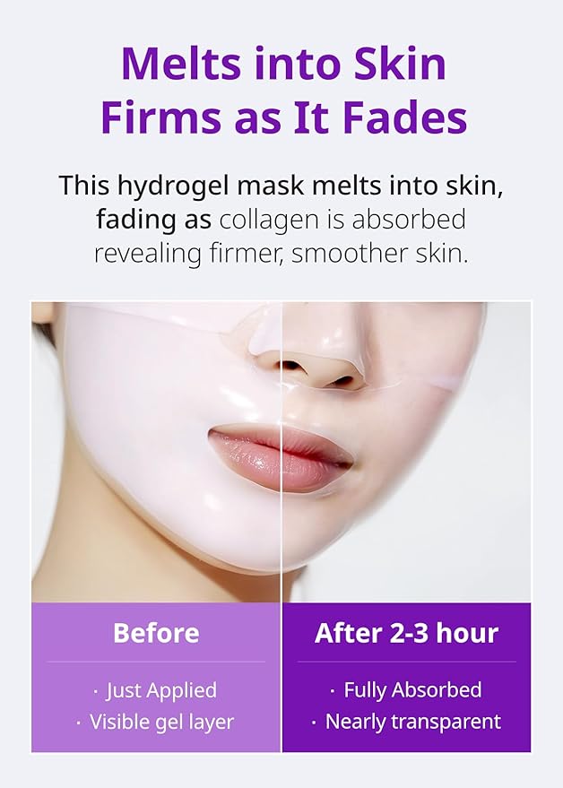- MELT IN SKIN COLLAGEN HYDROGEL: Solidified with collagen, this hydrogel mask melts into the skin for deep absorption overnight—locking in actives and minimizing moisture loss. In 2–3 hours, it turns nearly transparent to show full absorption.