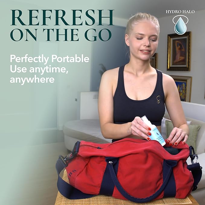 - Daily Skin Refreshment – Delivers a light mist of moisture that absorbs quickly, leaving no residue. Use Hydro Halo spray after workouts, during flights, or after sun exposure for hydration anytime, anywhere.