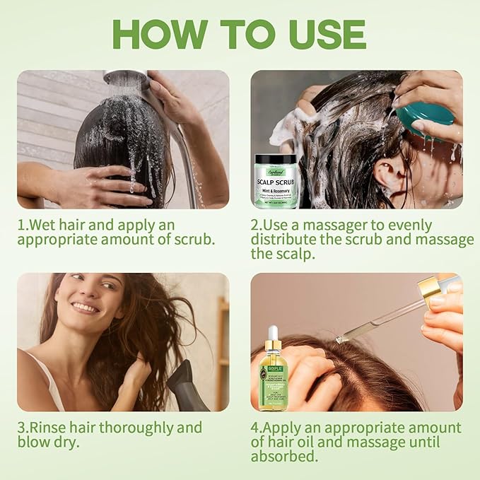 - COMPLETE SCALP CARE KIT: Each purchase includes our premium scalp scrub,a rosemary oil for hair, a silicone scalp massager. You can get a salon-quality dry scalp treatment at home. Your scalp will feel renewed