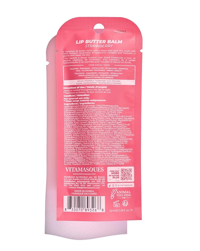 - Antioxidant-Rich Fruit Extracts: Infused with strawberry, cherry, blueberry, and raspberry extracts, Vitamasques lip butter balm offers antioxidant support and a naturally sweet scent in a soft, flavored lip balm texture