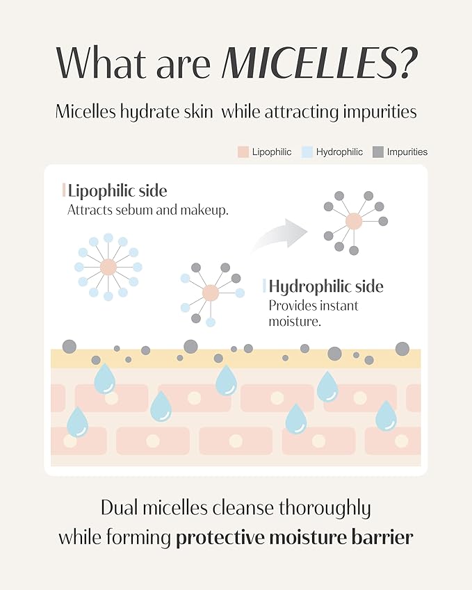 - POWERFUL MICELLAR TECHNOLOGY: Korean cleansing water with dual-layer micellar technology effectively removes makeup, impurities, and excess sebum while maintaining skin's moisture barrier for comfortable, thorough cleansing without irritation.