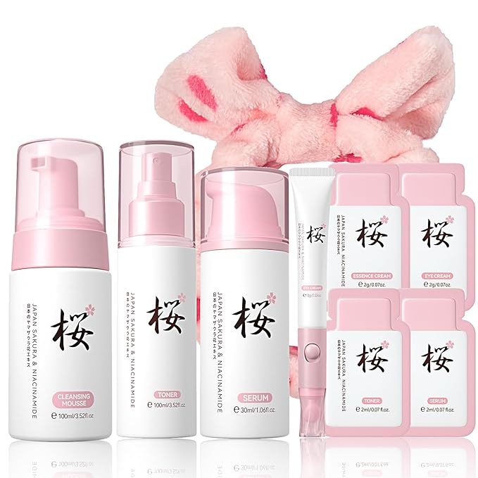 - 【Complete Facial Care Kit】: This kids skin care kit for women includes everything for a flawless routine: Sakura cleansing mousse, hydrating toner, revitalizing serum, nourishing eye cream, travel size skincare, plus a soft skin care headband. Perfect as a facial kit for women or teen skincare, it delivers deep hydration and anti-aging benefits for all skin types. Ideal as gifts for teenage girls or a travel skincare set for on-the-go freshness