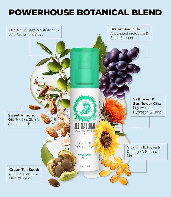 Bossman Skin, Scalp, and Hair Oil for Men & Women - 4 oz Moisturizing Body Oil - Emerald (Green Tea) Scent - Anti-aging, Hydrating, Scar Reducing Solution with Olive, Sunflower, Vitamin E