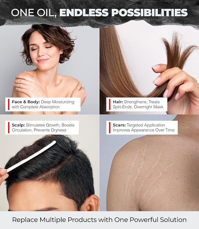 - HAIR & SCALP EFFECTS: Our moisturizing hair oil strengthens hair, prevents split ends, adds shine and smoothness. Nourishes scalp, prevents dryness and dandruff, boosts blood circulation when massaged - delivering nutrients to follicles for stronger, faster growth.