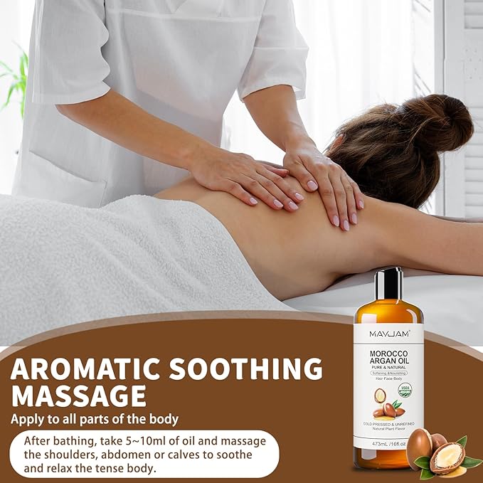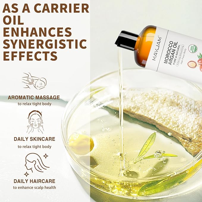 MAYJAM Organic Moroccan Argan Oil 16 Fl Oz, USDA Certified 100% Pure & Natural Carrier Oil For Dry, Damaged Skin, Hair, Face, Body & Scalp Moisturing, Massage Oils for Essential Oils Mixing (473ml)