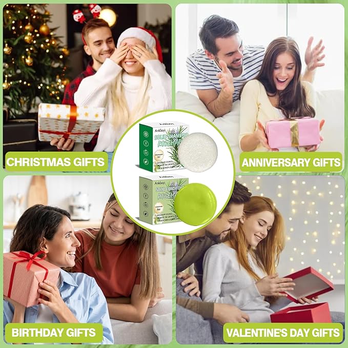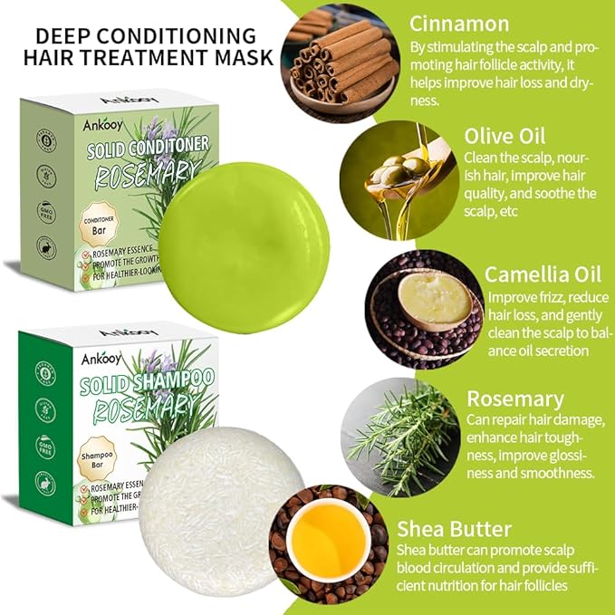 - Natural Shampoo & Conditioner Bars – This 2-pack set features a plant-based rosemary oil shampoo bar and matching solid conditioner, crafted with natural ingredients for a clean, sustainable hair care routine.