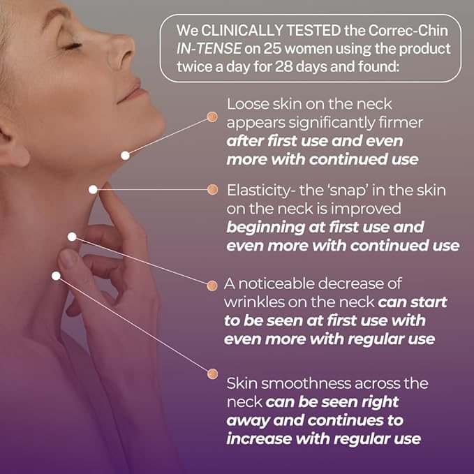 - INSTANTLY feel the skin tensing supportive wrap CORREC-CHIN IN-TENSE treatment provides, increases firmness, elasticity, and skin tonicity. Overtime, see a tighter looking profile with a noticeably lifted appearance to sagging loose skin on the neck, chin and jawline