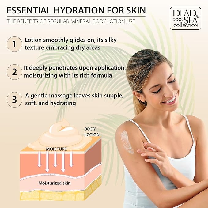 - With Minerals from the Dead Sea - Harness the power of Dead Sea minerals in body lotion, promoting skin vitality and elasticity. Experience a revitalizing blend that nourishes, leaving your skin with a radiant, healthy glow.