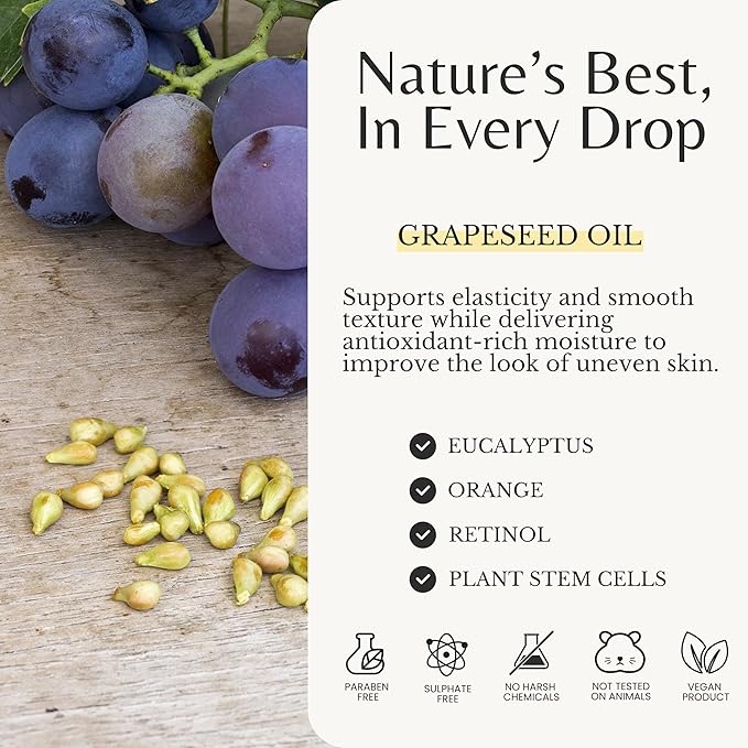 - POWERFUL BOTANICAL BLEND – Enriched with Grapeseed oil, Arnica Extract, Orange Peel Oil, Eucalyptus Oil & Retinol plus plant stem cells for a potent mix that nourishes, revitalizes, and promotes a more youthful glow.