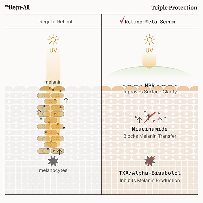 - MELANIN TRIPLE CARE: BLOCKS, PREVENTS, CLEARS — With HPR, Niacinamide, TXA, and Alpha-Bisabolol, this advanced tone-care system helps block melanin, control uneven tone, and target the appearance of spots for a clearer, more even-looking complexion.